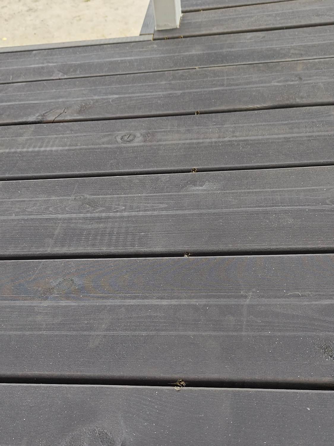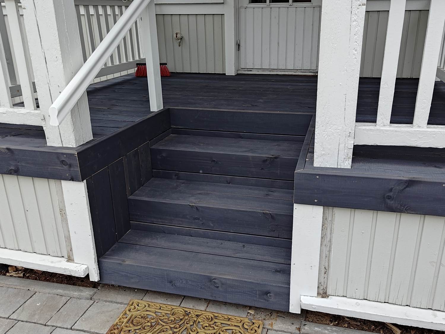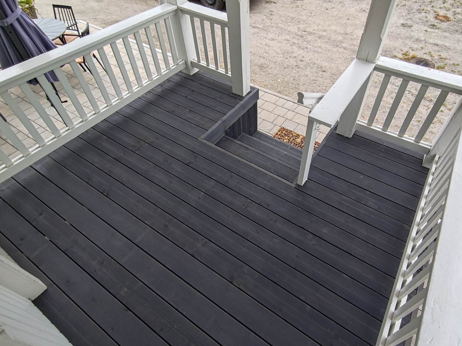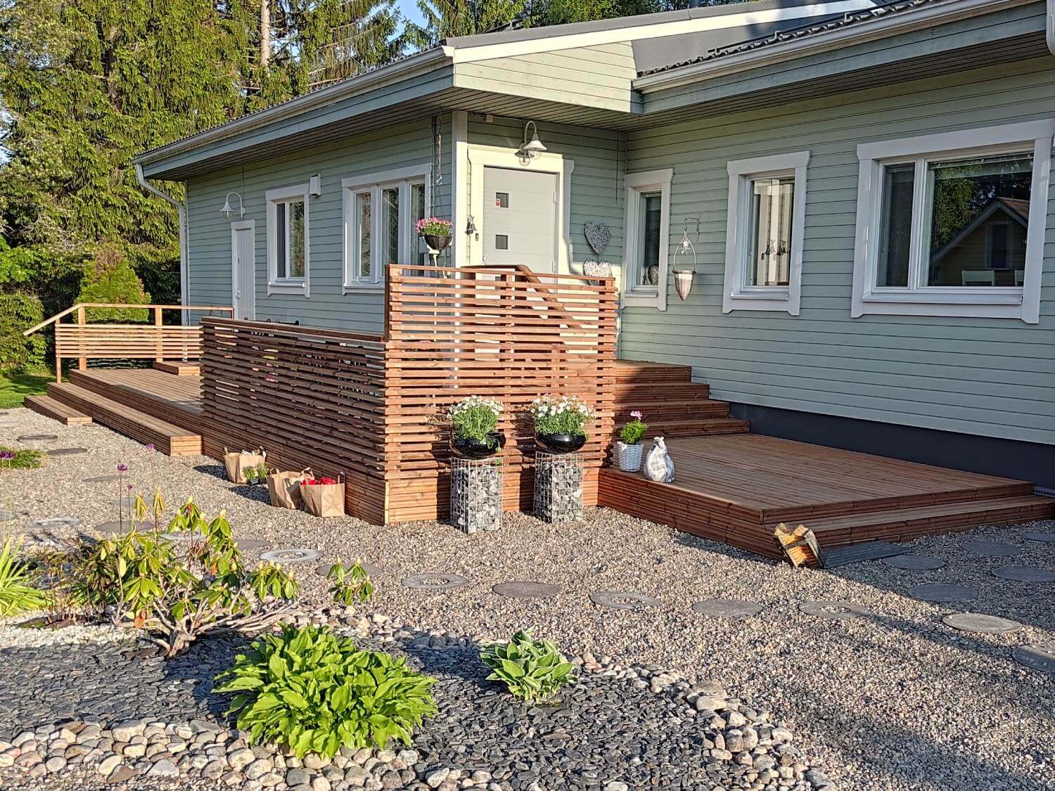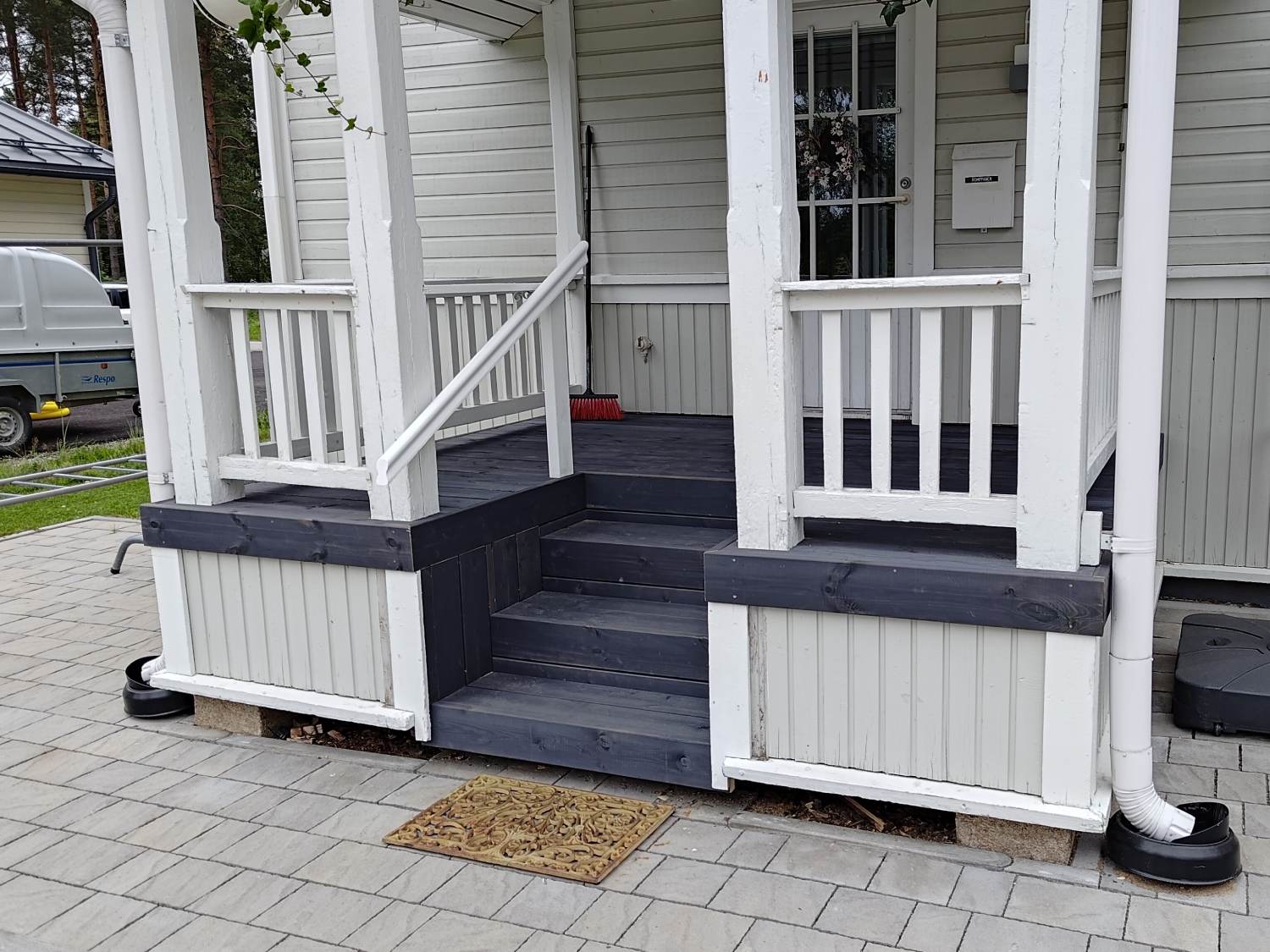 Remontissa uusittiin kuistin lattia. Lautana käytettiin leveää, harmaaksi käsiteltyä kestopuulautaa piilokiinnityksellä.