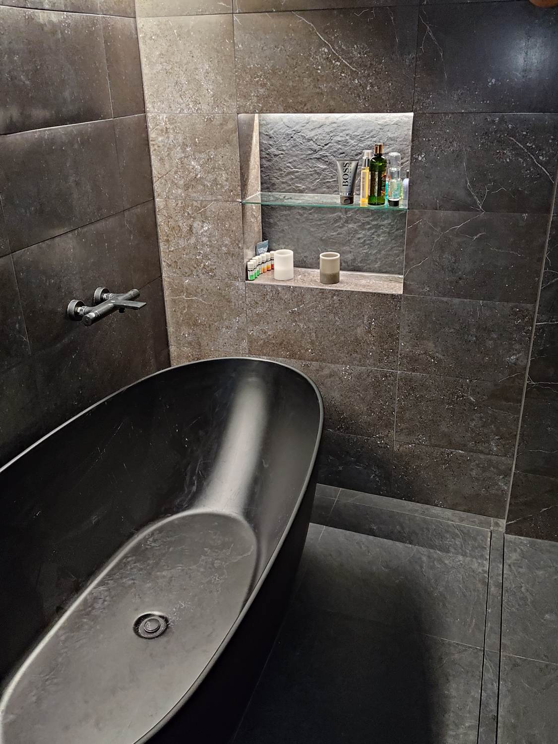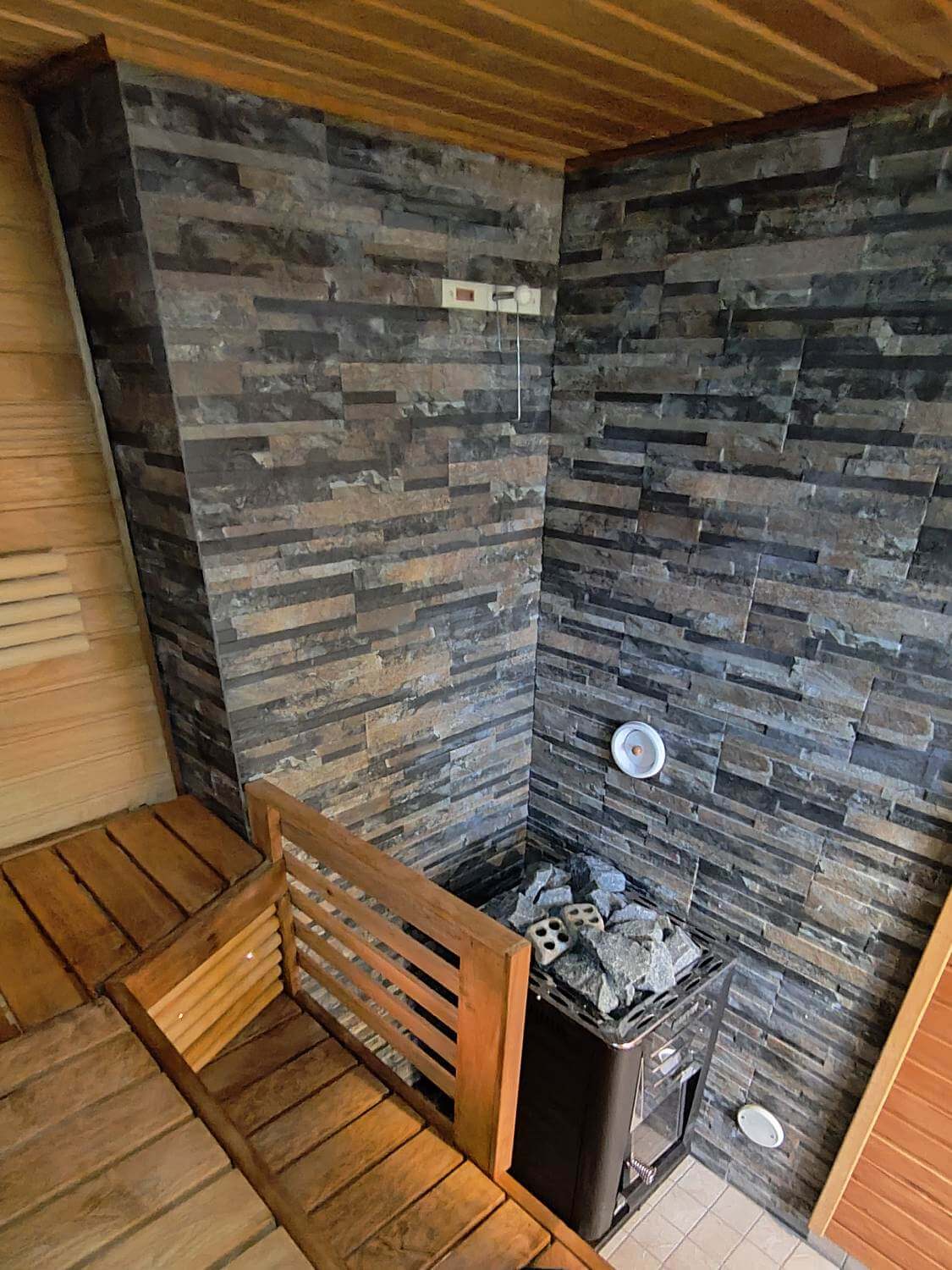 Remontissa uusittiin kylpyhuone kalusteineen. Saunaan asennettiin kiviverhoilu kiukaan taustalle.